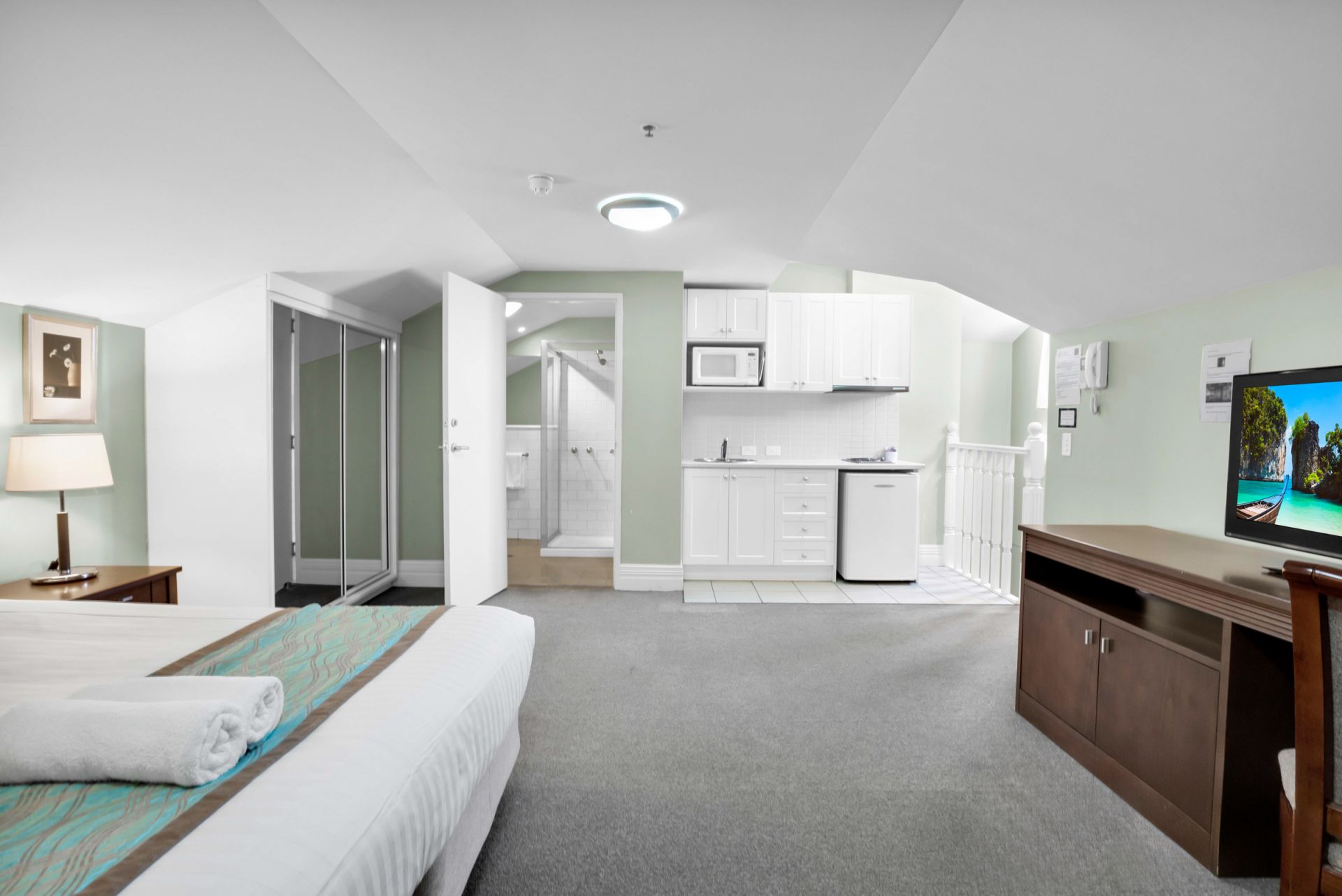 The primary apartment offers separate living, sleeping, and bathroom areas, along with a full kitchen and laundry, making it perfect for the short-stay market or as an urban residence. The second tenancy is a studio apartment with hotel-style amenities, complete with its own kitchenette and bathroom.
