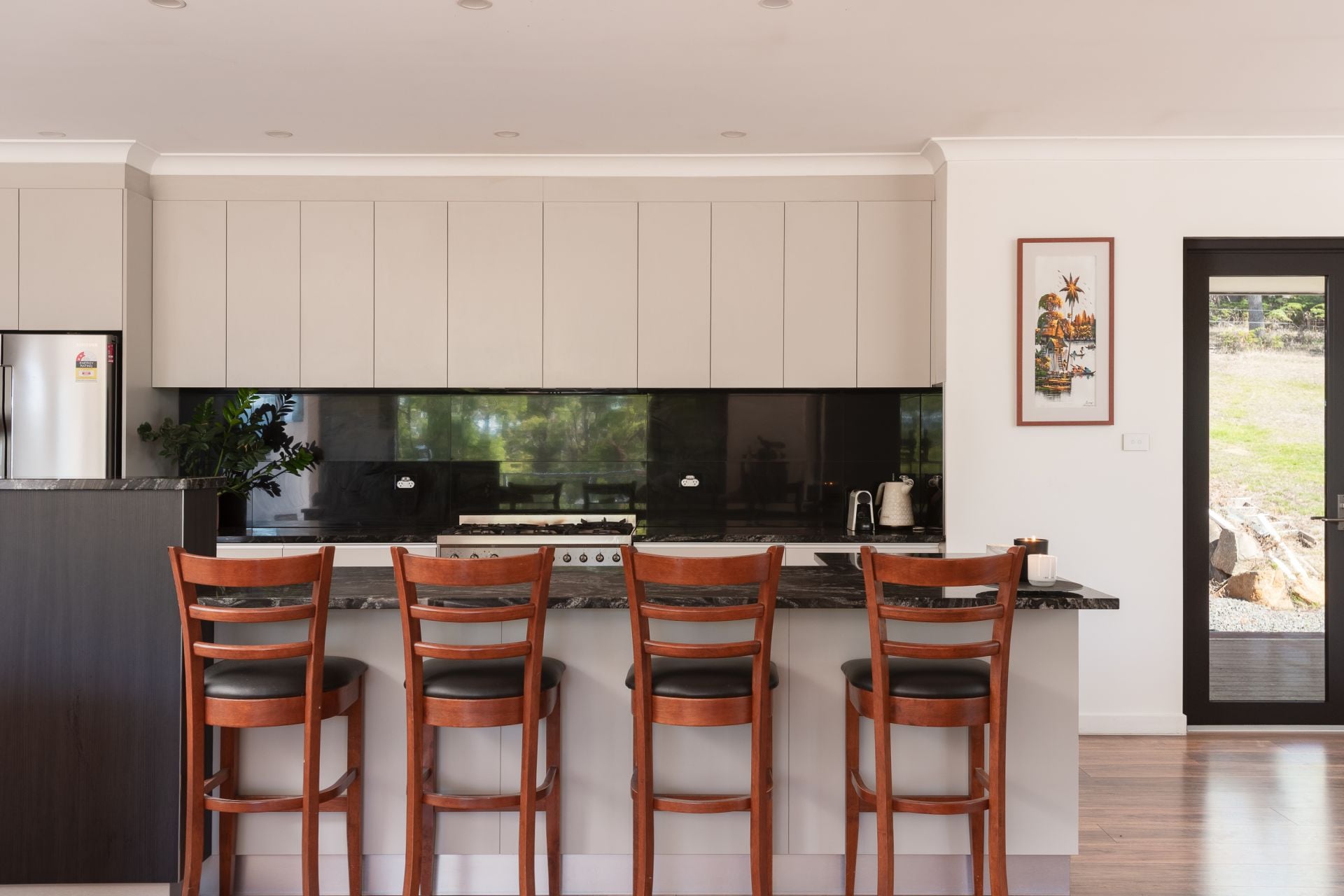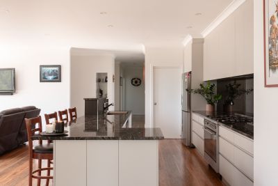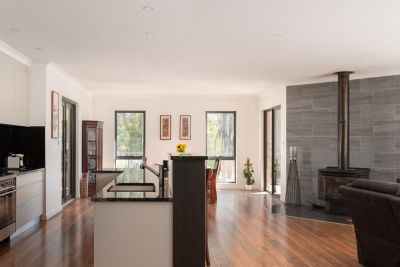 Internally, the scale of the home is immediately apparent. The primary living area is expansive, centred around a wood heater and framed by large windows that draw in natural light and the surrounding outlook. This space connects seamlessly to a well-appointed kitchen featuring granite benchtops, quality appliances and a butler's pantry, providing both functionality and separation for everyday use.