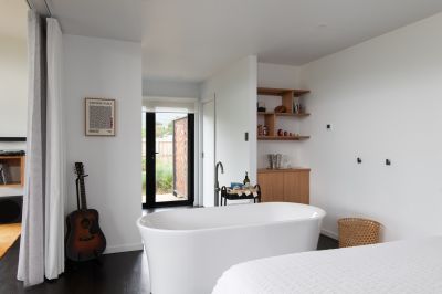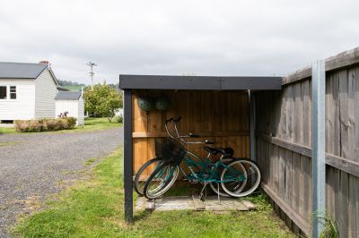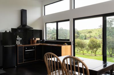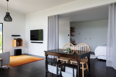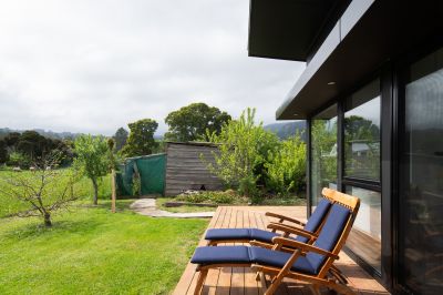 "Shibui" offers a fully self-contained, open-concept design that encompasses a well-equipped full kitchen, dining area, and a spacious living room. The generous bedroom features ample built-in storage, and you'll find a freestanding bath, a walk-in shower, and a separate toilet for your convenience. While you relax in the bath, take in picturesque views of Mount Arthur to the east and the rolling hills to the north. The living and dining areas open up to a sweeping wrap-around deck, with a pop-up sprinkler system maintaining the beautifully landscaped grounds. Neighboring farmland imparts a sense of seclusion, ensuring absolute privacy and luxurious tranquility.