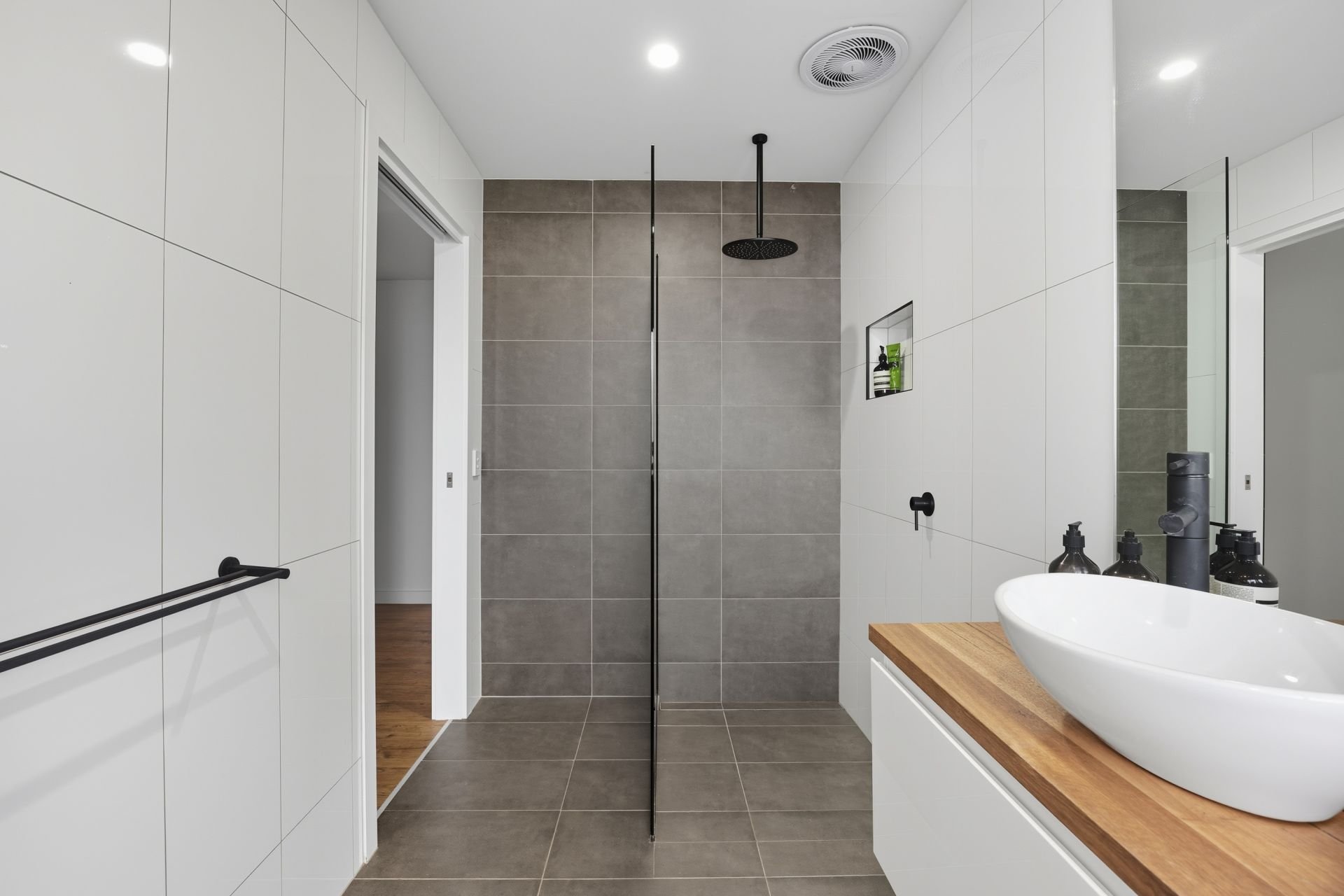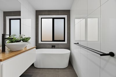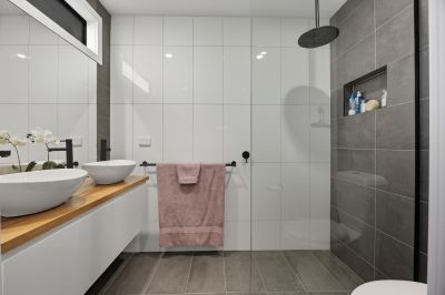 The bedrooms are strategically located at the rear of the block, guaranteeing a tranquil sleeping environment for the entire family. The primary bedroom, adorned with beautiful plantation shutters, is situated away from the other two bedrooms, ensuring privacy and separation. It features a spacious walk-through wardrobe and an ensuite bathroom with a double vanity and a walk-in rain shower. Two additional bedrooms, each with built-in wardrobes and plantation shutters, share the central bathroom that includes a bathtub, walk-in rain shower and a separate toilet.