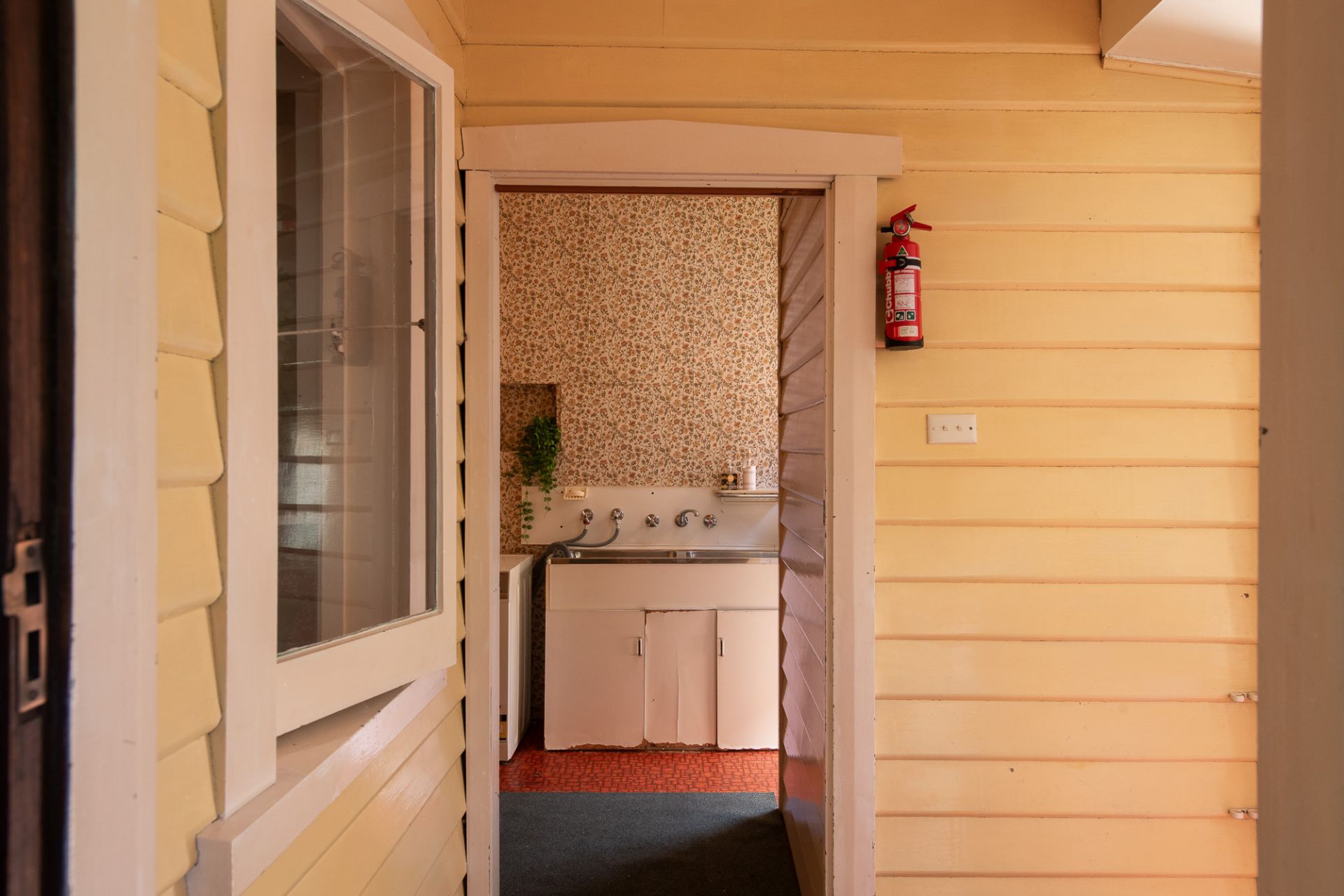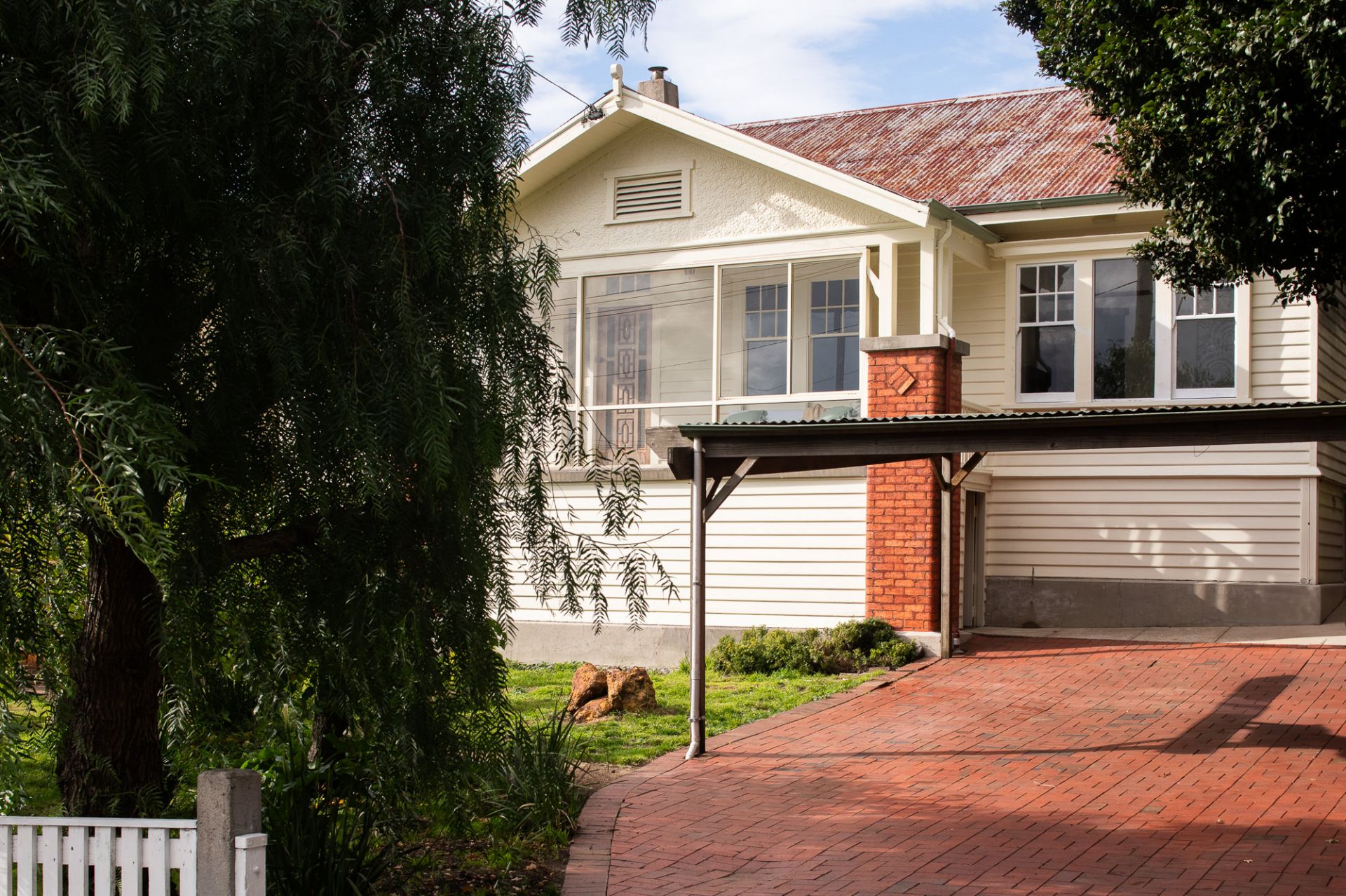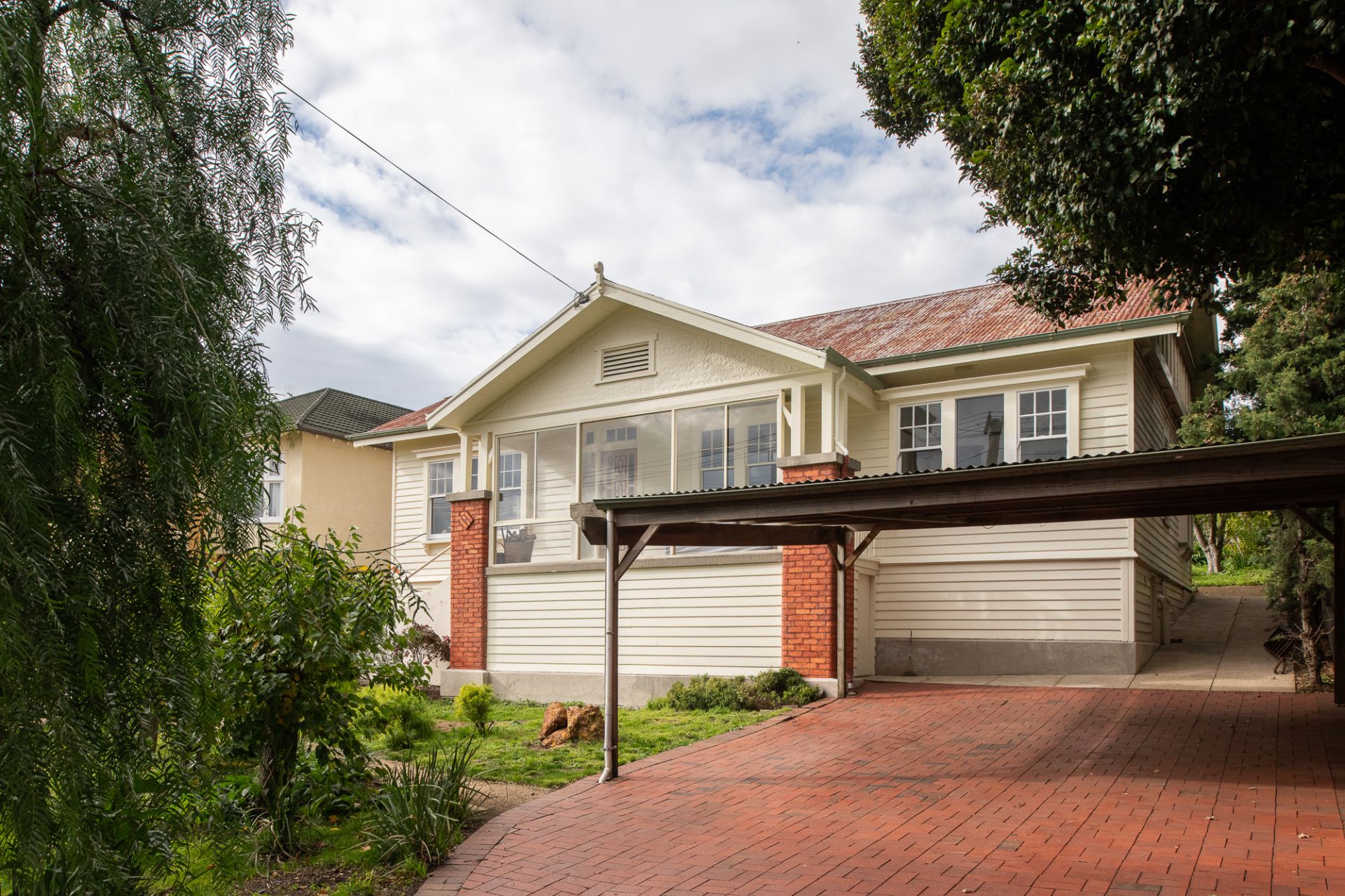 The classic 1930s weatherboard façade with enclosed verandah and red brick pillars sets a nostalgic tone, while the established front garden offers both privacy and street appeal. The wide brick driveway leads to a carport, offering practical off-street parking.