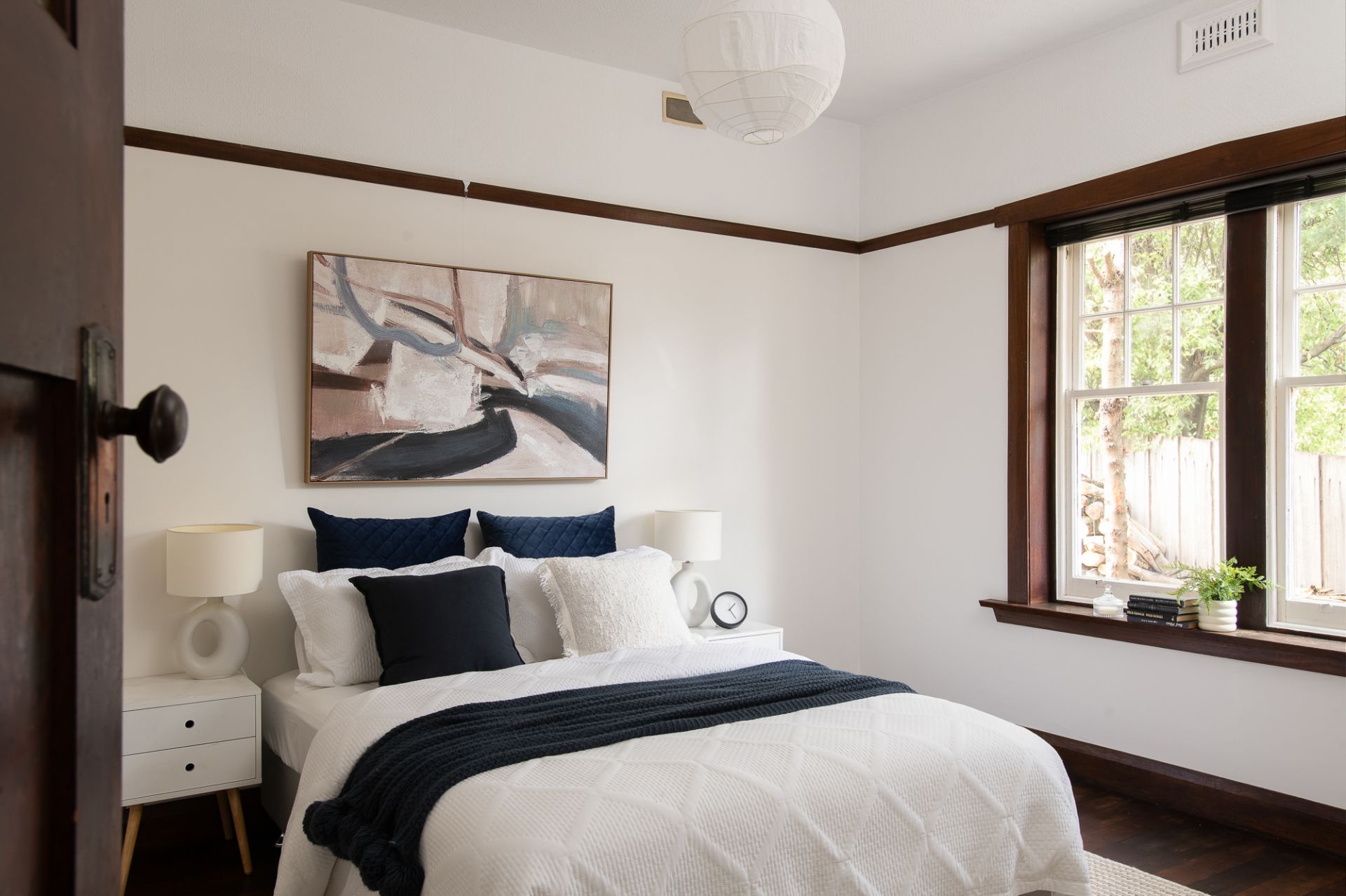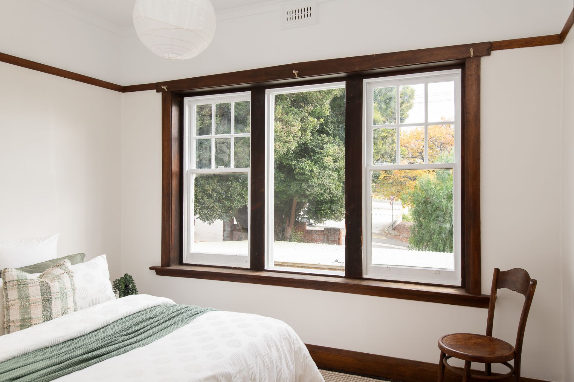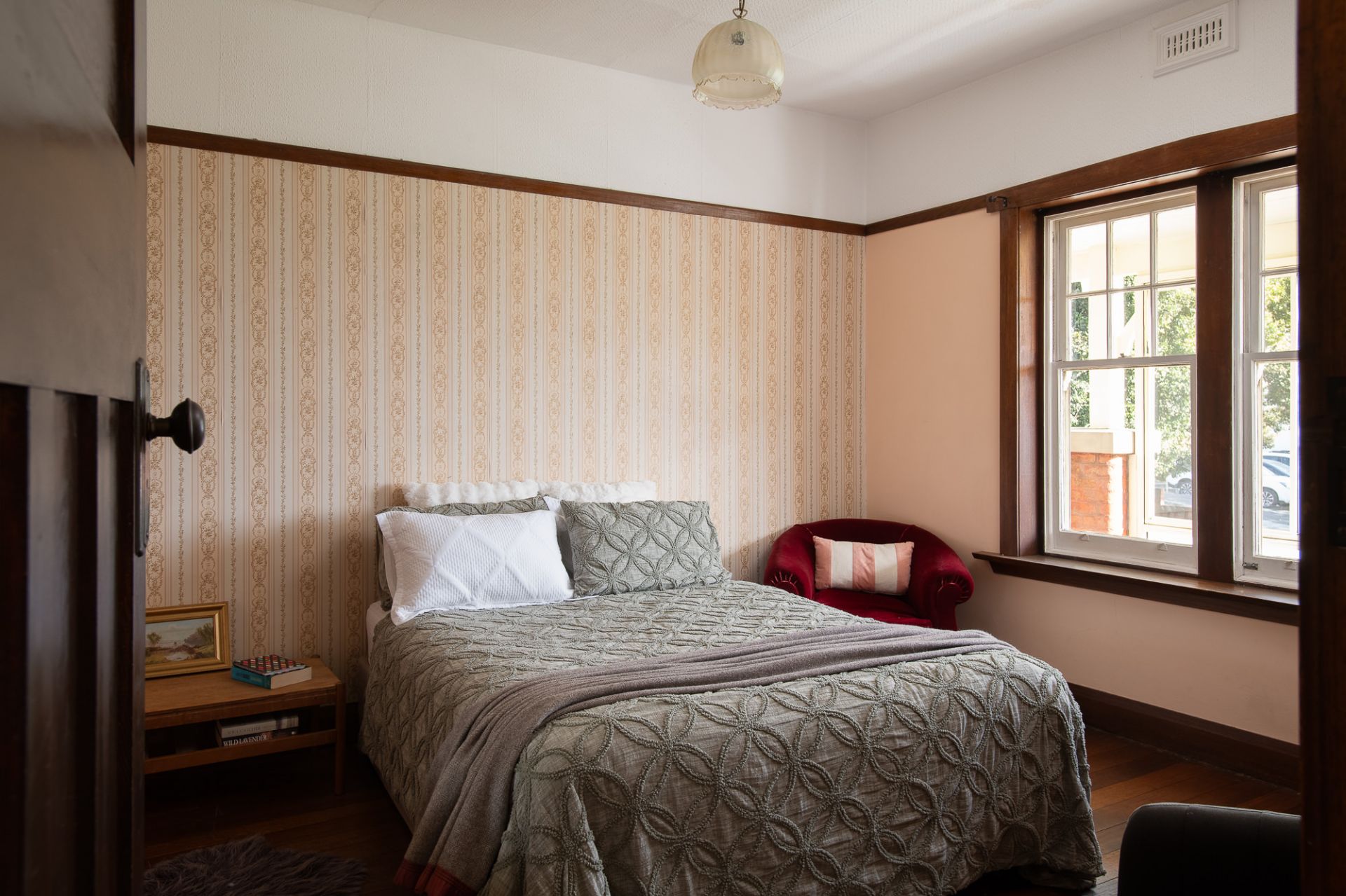 Each of the three bedrooms are well proportioned, with large windows that frame the garden or street views. The bathroom has vintage appeal, with a shower over bath and generous proportions.